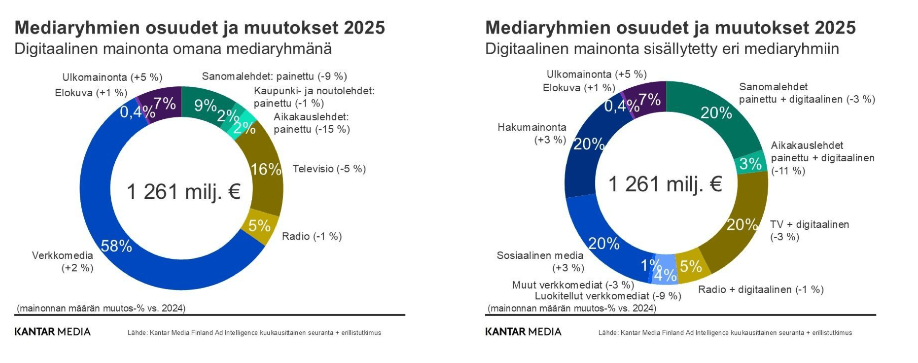 Mediamainontaan käytettiin Suomessa vuonna 2025 yhteensä 1 261 miljoonaa euroa, ja mainonnan määrä laski 0,7 prosenttia edellisvuoteen verrattuna. Vuoden ainoa kasvukuukausi oli huhtikuu (+6,6 %), mikä selittyi alue- ja kuntavaalien vaalimainonnalla.