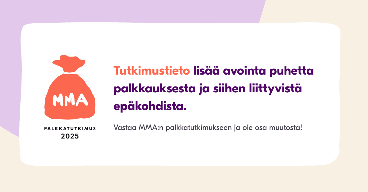 Vastaamalla MMA:n palkkatutkimukseen saat selville, miten oma palkkasi vertautuu alan mediaaniin, vaikutat palkkakehitykseen koko alalla ja tuet samalla nuorten mielenterveystyötä.